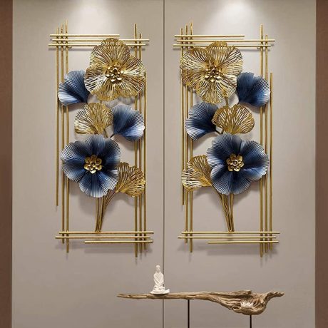 GGS Rectangle Blue and Gold Flower and Leaves Wall Art for Home, Living Room, Bedroom and Office Wall Decor