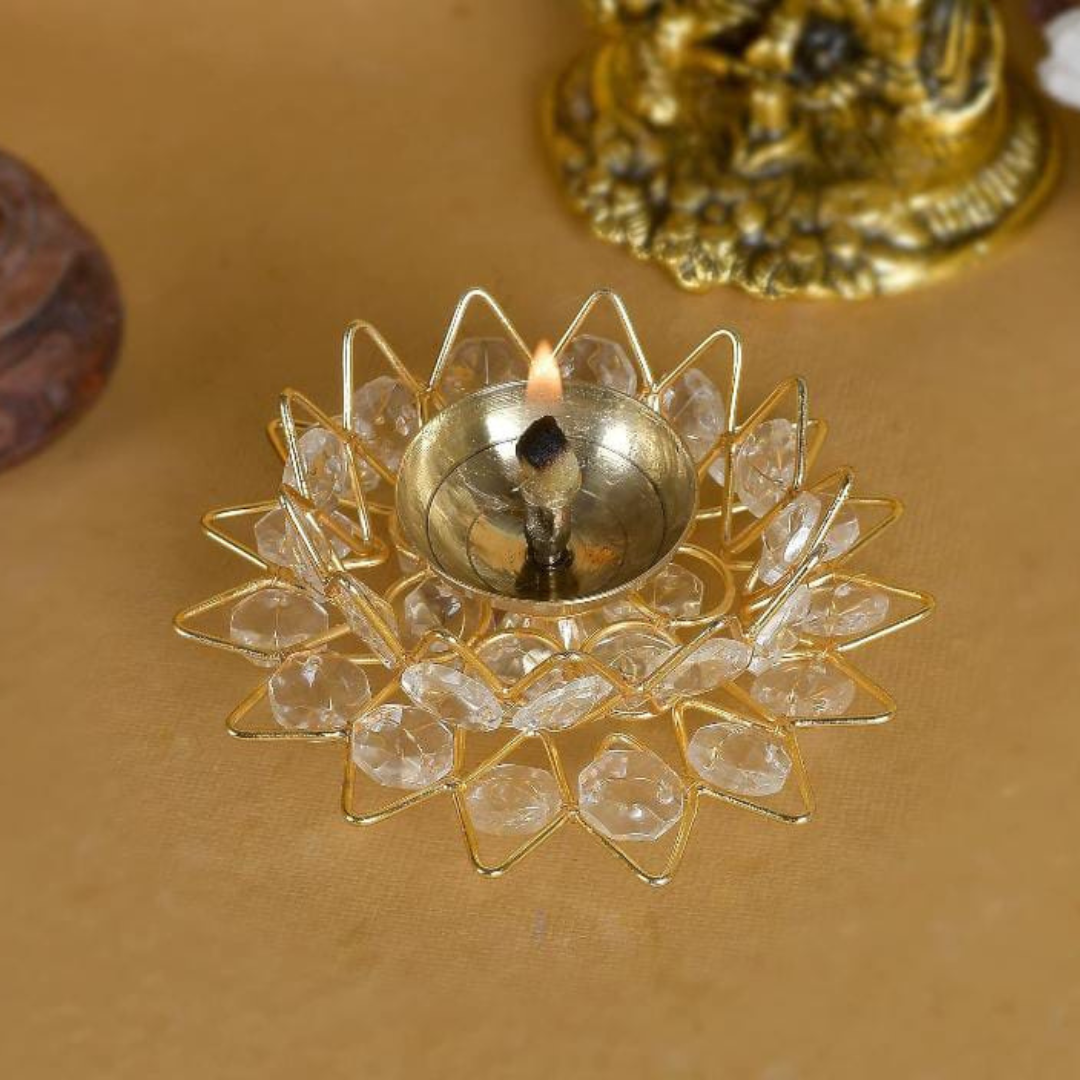 GGS 16 Stone Crystal Gold plated Oil Lamp Diya Puja Lamp with Single Cotton Wick for Home Temple, Puja Mandir, Home Décor