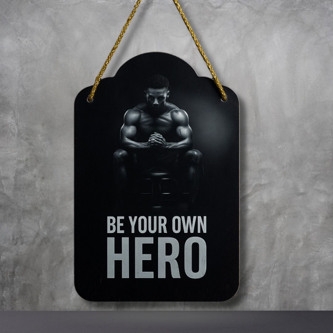 Channel your inner strength and push your limits with this bold “Be Your Own Hero” wall hanging. Featuring a powerful image of a muscular figure deep in thought and ready for action, this black wooden plaque is perfect for gym lovers, athletes, and anyone chasing greatness. Whether it’s your home gym, office space, or bedroom, let this sign remind you daily to rely on yourself, stay disciplined, and be the hero of your own story. Durable, lightweight, and ready to hang with a strong rope—this piece is more than decor; it’s a mindset.