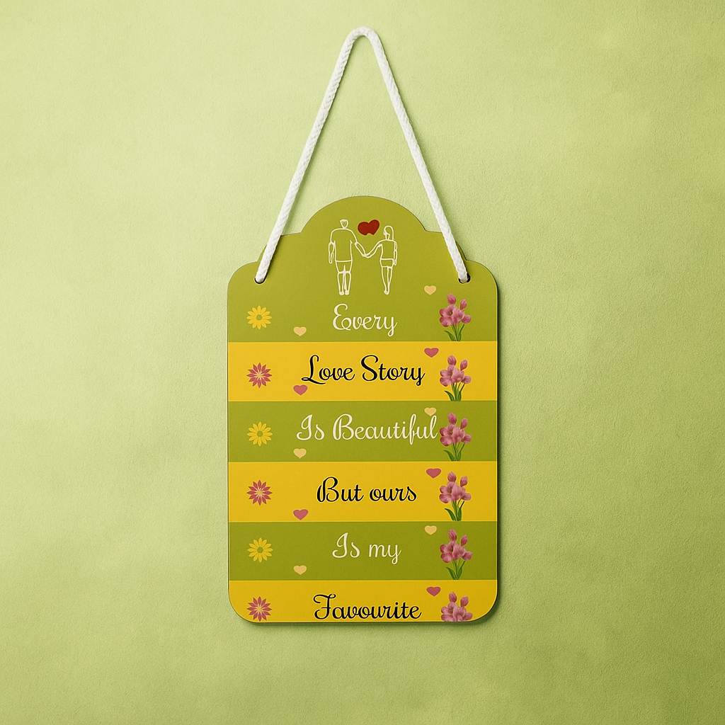 Celebrate your unique bond with this charming love-themed hanging plaque. Featuring the heartfelt quote, “Every Love Story Is Beautiful, But Ours Is My Favourite,” this decorative piece is perfect for couples looking to add a romantic touch to their home. With soft green and yellow tones, floral details, and a sweet illustration of a couple holding hands, it’s an ideal addition to bedrooms, living rooms, or gift baskets for anniversaries and Valentine’s Day. Lightweight and ready to hang, this sign is a daily reminder of your special connection.