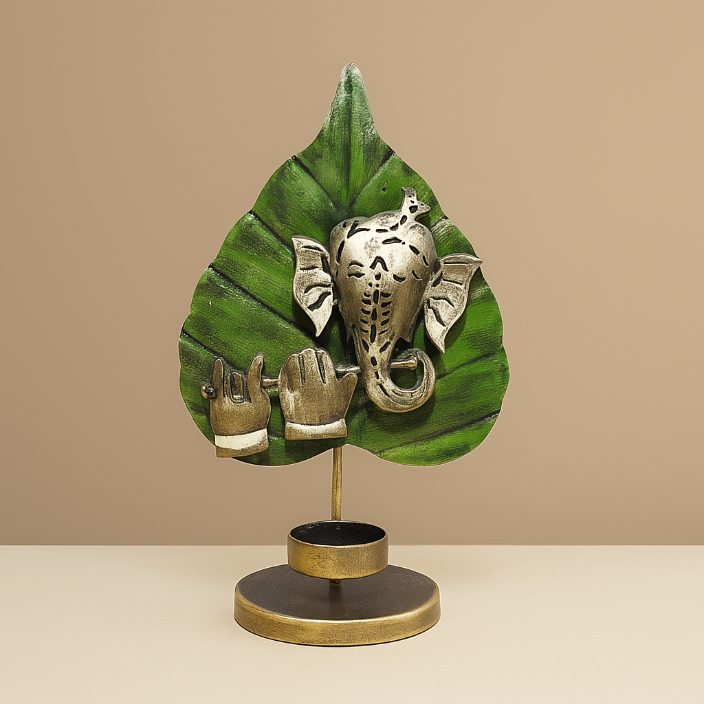 GGS IP Ganesh T Lite Sacred Fig Leaf Green and Silver Candle Holder.