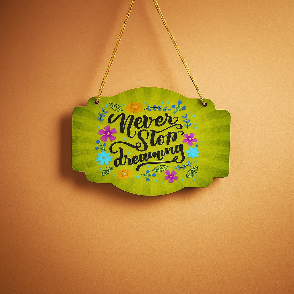 Add a touch of positivity to your space with this charming “Never Stop Dreaming” hanging plaque. Crafted on a vibrant green background with floral accents, this motivational sign is perfect for bedrooms, offices, study areas, or creative corners. Made from lightweight yet durable material and suspended with a sturdy cord, it’s easy to hang and sure to lift your spirits every time you see it. Whether you’re gifting a friend or decorating your own nook, this plaque is a gentle reminder to chase your dreams every day.