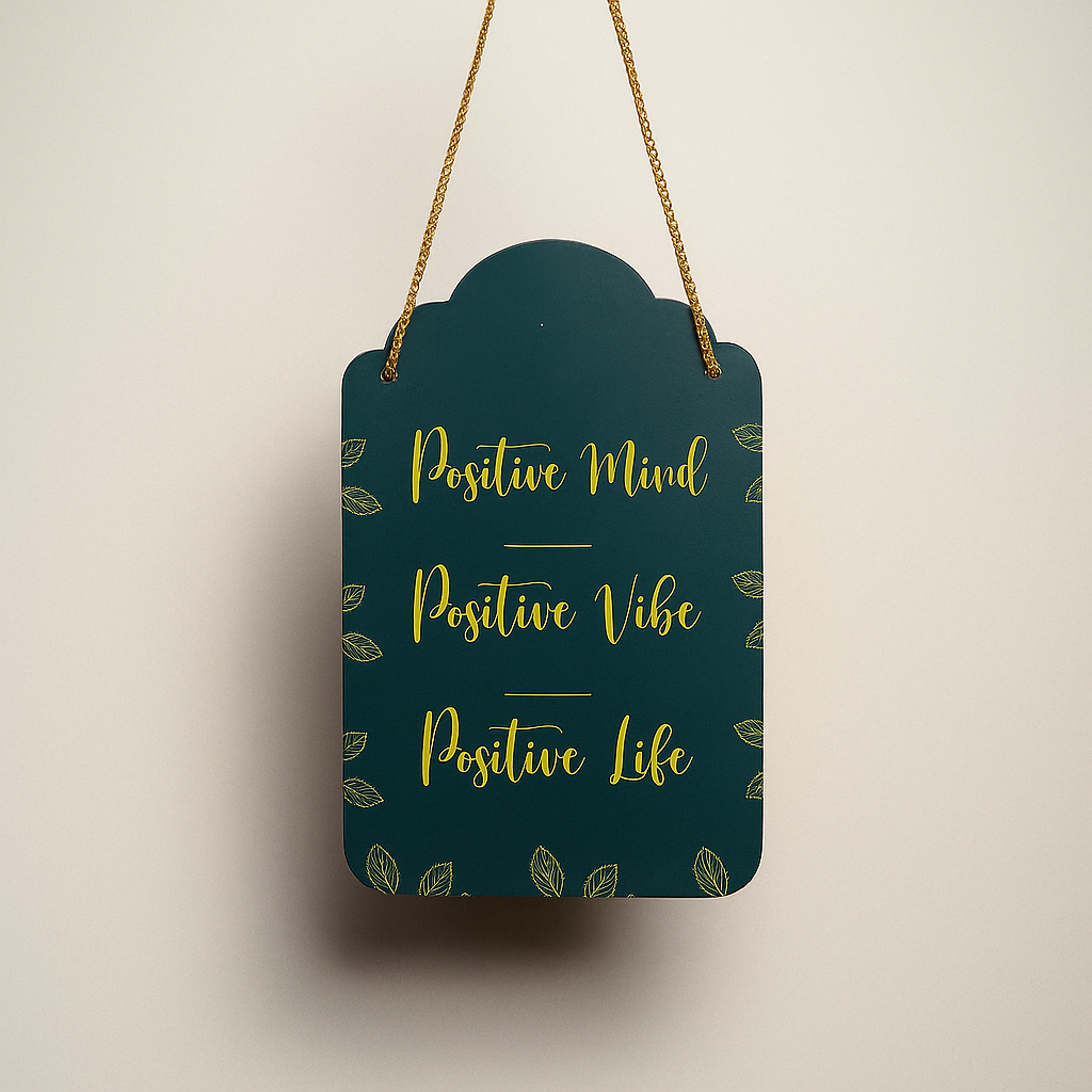 Surround yourself with good energy and meaningful reminders with this beautifully designed “Positive Mind, Positive Vibe, Positive Life” hanging sign. With its deep green background, elegant yellow script, and subtle leaf patterns, this wooden decor piece adds a calming and uplifting touch to any room. Whether you hang it in your bedroom, living room, office, or wellness space, this sign serves as a daily dose of motivation and peace. Lightweight, durable, and easy to hang with its golden rope—perfect for gifting to loved ones or treating yourself to mindful decor.