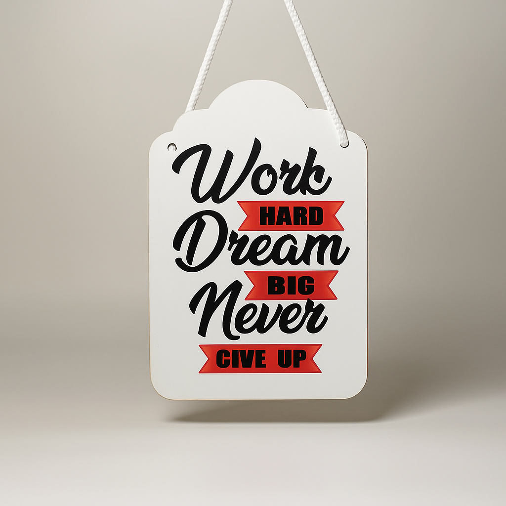 Boost your daily motivation with this bold and stylish hanging sign featuring the powerful message: “Work Hard, Dream Big, Never Give Up.” Crafted on a sturdy wooden plaque with a sleek white background and eye-catching black and red typography, this decor piece is perfect for bedrooms, study areas, office cabins, or gym walls. Its compact design and rope hanging make it easy to place anywhere you need a dose of inspiration. A great gift for students, entrepreneurs, fitness enthusiasts, and dreamers alike!