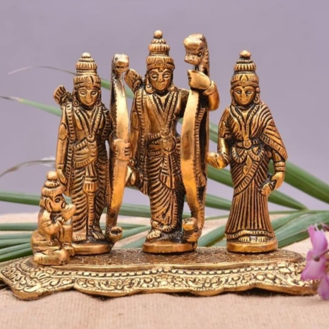 This exquisite Ram Darbar gold painted statue is a stunning addition to any puja room or sacred space. Meticulously crafted with intricate details, it depicts Lord Rama, Sita, Lakshmana, and Hanuman in a regal ensemble. The rich golden hue and ornate carvings create an aura of divinity, making it a revered centerpiece for devotional rituals. Measuring approximately 10 cm in height and resting on an elegantly carved base, this statue is a timeless symbol of faith and devotion. Crafted with utmost care by skilled artisans, it serves as a beautiful reminder of the divine presence in your home.